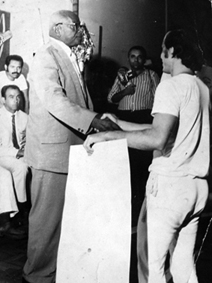 Mestre Bimba em sua visita a São Paulo entrega diploma a Mestre Suassuna.