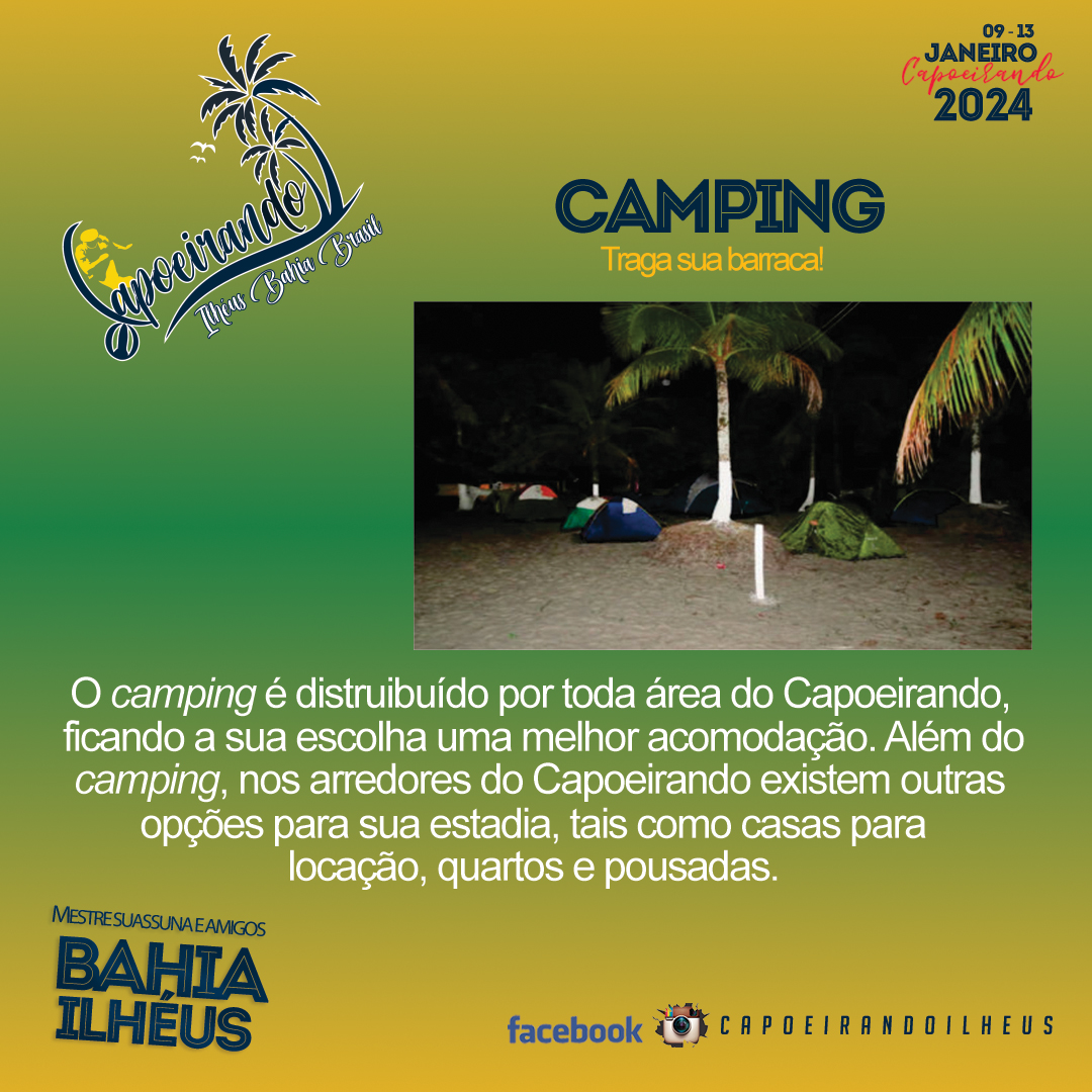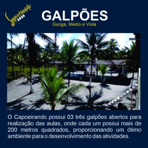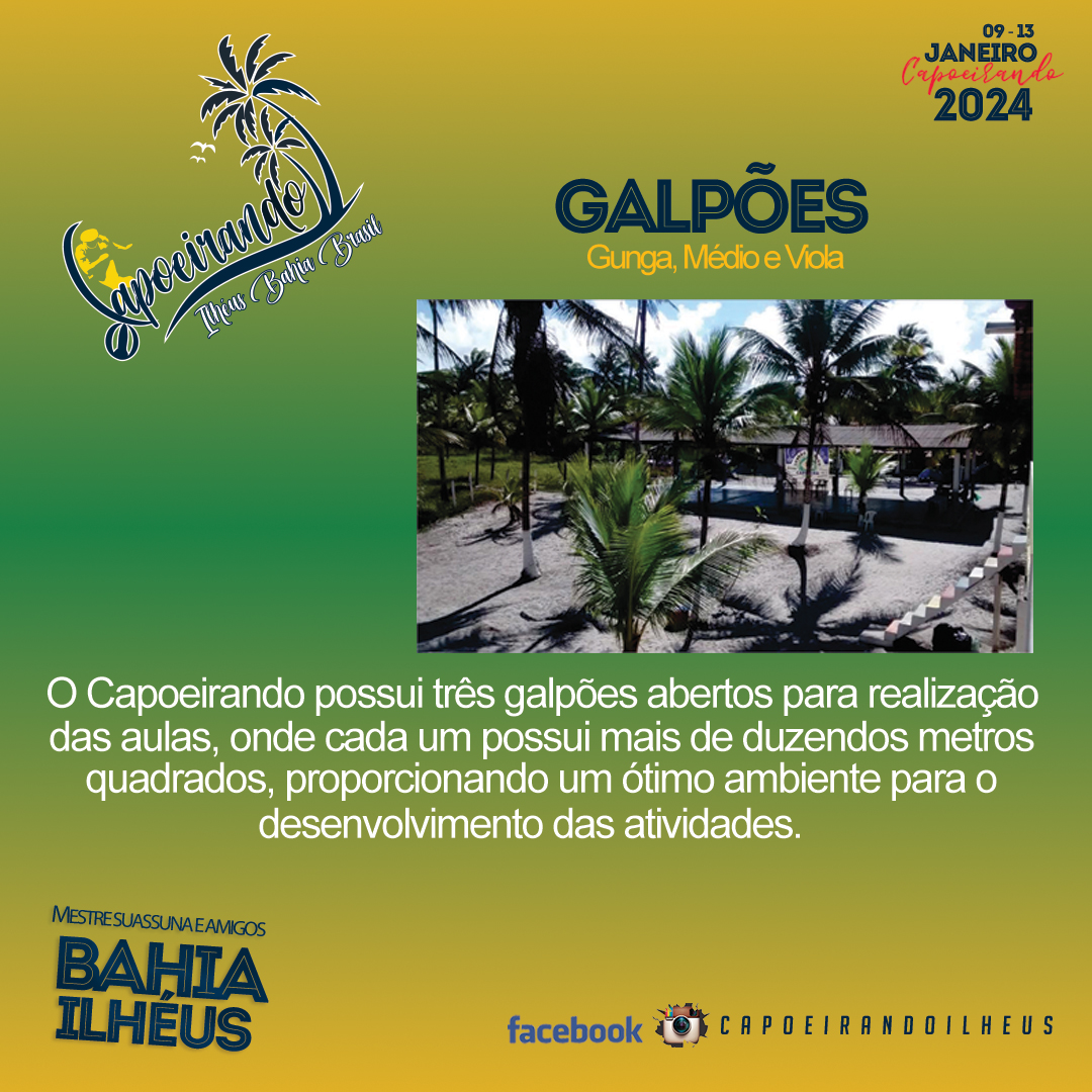 Você também terá a oportunidade de conhecer diversas pessoas, ampliar seu ciclo de amizade e ainda enriquecer seus conhecimentos agregando valor à sua Capoeira. As aulas e rodas acontecem nos períodos da manhã, no final da tarde e a noite, divididos em três galpões podendo somente participar quem fizer sua inscrição e adquirir sua pulseira de acesso.